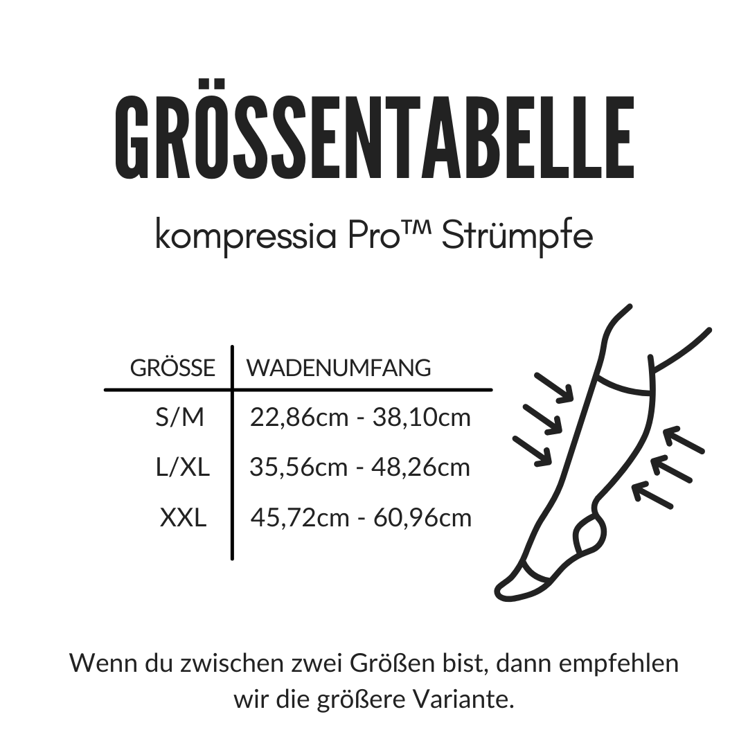 Die Kompressia Pro Strümpfe verfügen über 20-30 mmHg und entsprechen somit der Kompressionsklasse 2. So erhälst du die perfekte Menge an Druck, die deine Beine benötigen.